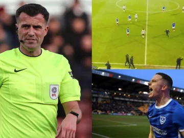 អ្នកគាំទ្រក្លឹប Port Vale ត្រូវរារាំងដោយកីឡាករ និងបុគ្គលិកនៅក្នុងកីឡដ្ឋាន បន្ទាប់ពីបានដេញតាមលោកអាជ្ញាកណ្តាល Craig Hicks ព្រោះតែការផ្តល់បាល់ទៅដល់ក្លឹប Portsmouth។ លោក Hicks បានធ្វើការសម្រេចចិត្តផ្តល់បាល់ប៉េណាល់ទីទៅដល់ Portsmouth នៅនាទីទី 88 បន្ទាប់ពីកីឡាករ Conor Grant ធ្វើអោយកីឡាករ Abu Kamara ដួលក្នុងតំបន់គ្រោះថ្នាក់។ អ្នកគាំទ្រផ្ទះមានការខកចិត្តចំពោះការសម្រេចចិត្ត ដោយអ្នកគាំទ្រចិត្តក្លាហានមួយរូបអស់ការអត់ធ្មត់ ហើយបានរត់ចូលទៅទីលានសំដៅទៅរកអាជ្ញាកណ្តាលតែម្តង។ កីឡាករ និងបុគ្គលិករបស់ក្លឹប Port Vale រួមទាំងគ្រូបង្វឹក Andy Crosby និងជំនួយការ ...