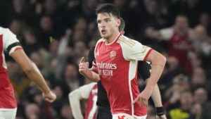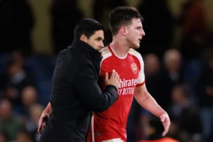 Chelsea បាននាំមុខពីរគ្រាប់រហូតដល់នាទីទី 77 នៃការប្រកួត London Derby នៅកីឡដ្ឋាន Stamford Bridge រហូតទាល់តែ Rice វាយបកទៅលើអ្នកចាំទី Robert Sanchez របស់ក្រុមតោខៀវ ដោយការស៊ុតបាល់ដំបូងពីចម្ងាយចូលសំណាញ់ទីបានយ៉ាងល្អ។ 7 នាទីក្រោយមក Leandro Trossard បានរកគ្រាប់បាល់តាមស្មើដែលធានាបាននូវមួយពិន្ទុដ៏សំខាន់មួយសម្រាប់ក្រុមកាំភ្លើងធំ។